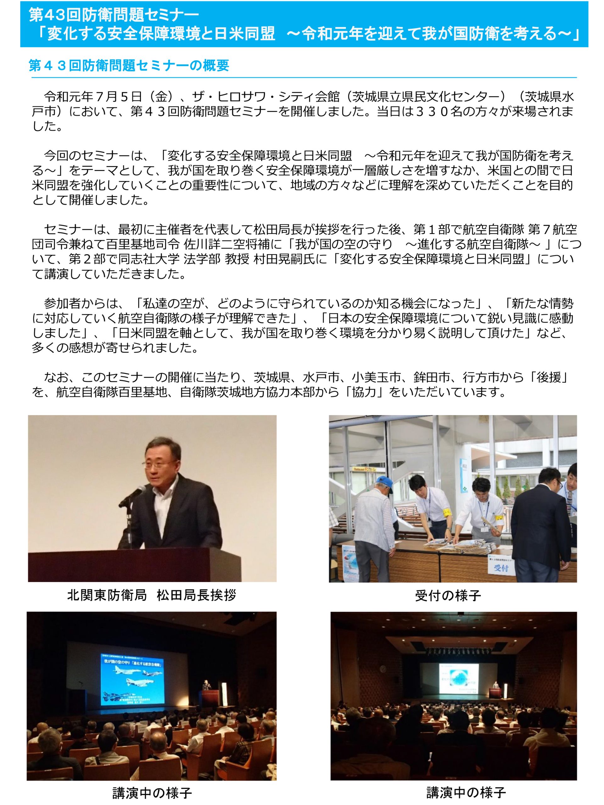 2019年7月5日、ザ・ヒロサワ・シティ会館(茨城県民文化センター:水戸市)で開催された「第43回防衛問題セミナー」に、航空自衛隊支援部会も参加しました。
